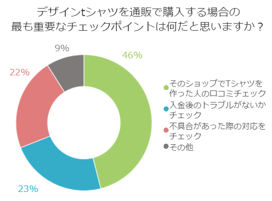 通販の場合、いろいろトラブルが起きていることを耳にした人もいるのではないでしょうか。そこで、通販でデザインTシャツを買う際、最も重要視するポイントは何かアンケートをとってみました。
